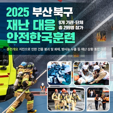 2025년 재난대응 안전한국훈련 실시 10월 29일 오후 3시 토론, 현장훈련화재·지진 등 대응 역량 점검 북구가 각종 재난으로부터 구민의 생명과 재산을 지키기 위한 ‘2025 재난대응 안전한국훈련’을 오는 10월 29일(수) 오후 3시에 실시한다.토론훈련은 북구청 재난안전상황실에서, 현장훈련은 인재개발원(북구 효열로 256)에서 진행되며, 화재를 중점재난으로, 지진·원자력까지 연결되는 복합재난 시나리오로 실전 대응 역량을 점검한다.훈련은 ‘재난 및 안전관리 기본법’ 제35조에 근거한 전국 단위 프로그램으로, 중앙...