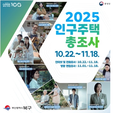 2025년 인구주택총조사, 구민들의 답변을 기다립니다 10월 22일~11월 18일, 전국 실시복지·경제·교통 등 정책 기초자료 통계청이 주관하는 ‘2025 인구주택총조사’가 10월 22일(수)부터 11월 18일(화)까지 전국적으로 실시된다.인구주택총조사는 우리나라에 거주하는 모든 내·외국인과 주택의 규모·특성을 파악해 지역 복지·경제·교통 등 정책 수립의 기초자료로 활용되는 국가 기본 통계조사로, 1925년 첫 조사 이후 올해로 정확히 100주년을 맞았다.북구에서는 11월 1일 0시를 기준으로 관내 20% 표본조사...