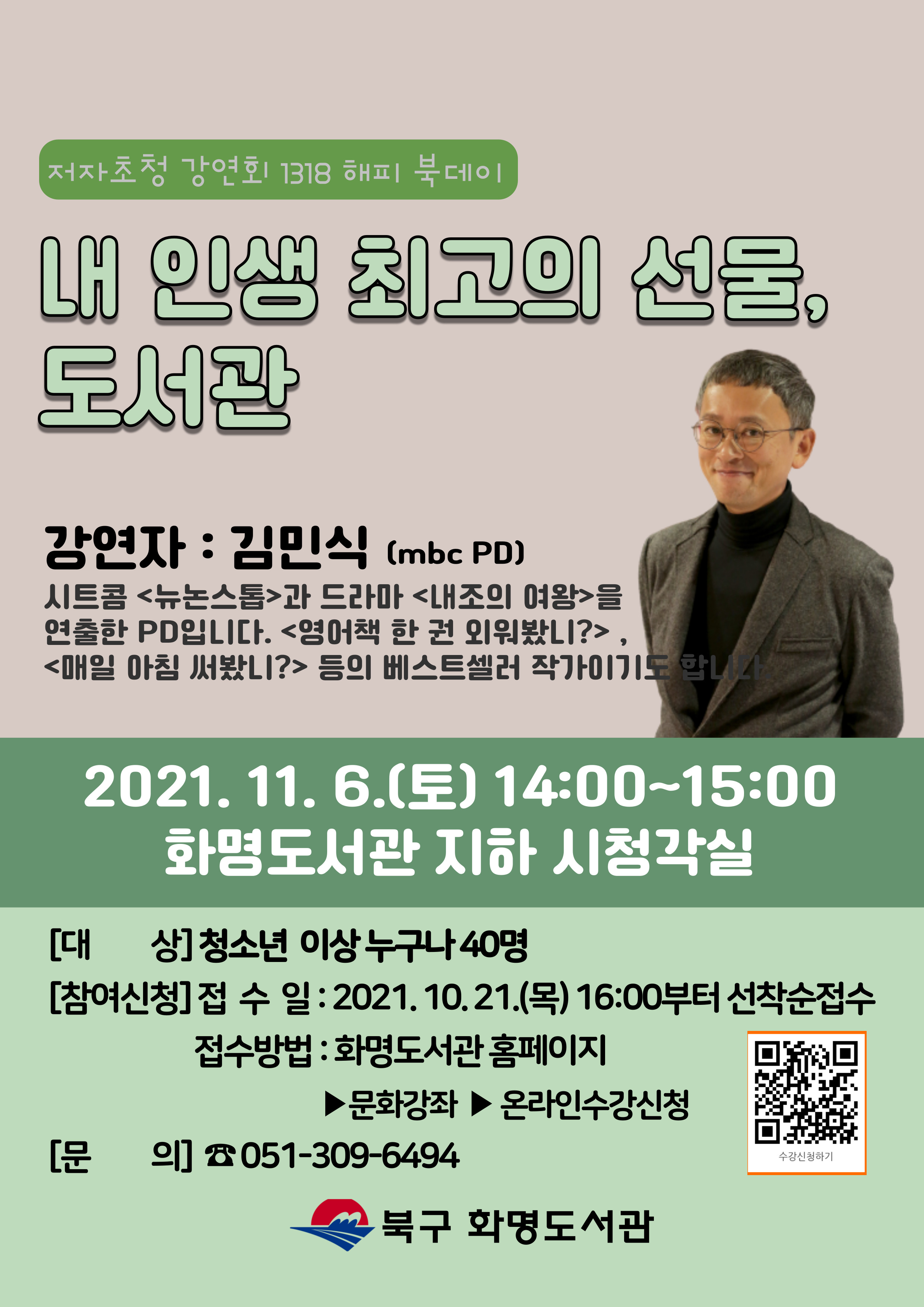 ![]() (저자초청 강연회 1318 해피북데이) 김민식 PD 초청강연 내 인생 최고의 선물, 도서관 - 일시 : 2021. 11. 6.(토) 14:00~15:00 - 장소 : 화명도서관 지하 시청각실 - 대상 : 청소년 이상 누구나 40명 (※ 코로나-19 거리두기 상황에 따라 인원 조정 가능) - 신청방법 : 화명도서관 홈페이지 온라인 수강신청 ※ 신청시 비고란에 학교, 학년 작성 바랍니다. ※ 보호자가 대신 신청하시는 경우 참석하는 학생을 이름, 학교, 학년 비고란에 작성 바랍니다. ※ 수강 확정자에게는 강연 1~3일전에 문자로 안내 드립니다. |