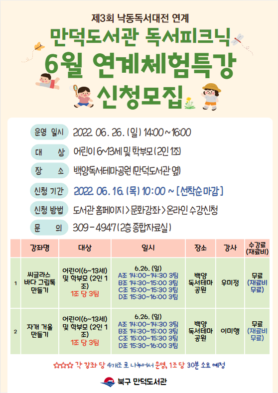 만덕도서관 독서피크닉 6월 연계 체험 특강을 아래와 같이 운영하오니 아래 내용을 확인하시고 신청해주시기 바랍니다.