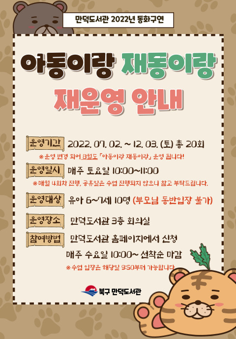 ![]() [만덕도서관 유아 동화구연] 아동이랑 재동이랑 ○ 기 간: 2022. 10. 1.(토) ~ 12.03.(토), 매주 토요일 1회 진행(총 9회) ※ 운영변경되어 8월에도 아동이랑 재동이랑이 운영되오니 참고 부탁 드립니다! ○ 일 시: 2022. 10. 1.(토) 10:00~11:00 ※ 수업 입장은 해당일 9:50 부터 가능 ○ 대 상: 유아 6~7세, 10명 (선착순마감)(부모님 동반입장 불가) ○ 장 소: 만덕도서관 3층 회의실 ○ 강 사: 감동진 주먹구구 동아리 ○ 수강료 및 재료비 : 무료 ○ 선착순으로 정원10명 신청받습니다. - 부모님 ID로 신청할 때 : 비고란에 아이 "이름과 생년" 을 반드시 적어주세요. - 어린이 ID로 신청할 때 : 생년을 반드시 입력해주세요. ○ 신청기간 : 2022. 09. 28.(수) 10:00 ~, 선착순 모집 ○ 신청방법 : 만덕도서관 홈페이지 온라인 수강신청 ○ 문의 : ☎309-2091(만덕도서관 어린이자료실) |