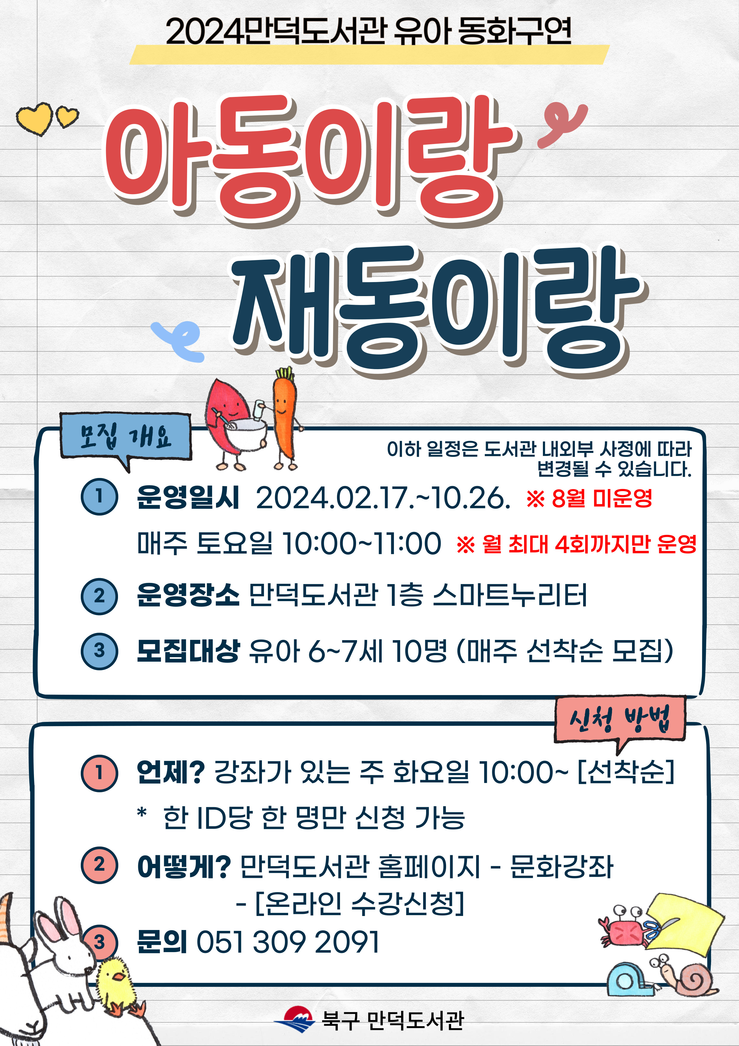 ○ 일 시: 2024. 4. 20.(토) 10:00~11:00 ※ 수업 입장은 해당일 9:50부터 가능 ○ 대 상: 유아 6~7세(18년도, 19년도 출생) 10명 (선착순마감)(부모님 동반입장 불가) ○ 장 소: 만덕도서관 1층 스마트누리터 ○ 강 사: 감동진 주먹구구 동아리 ○ 수강료 및 재료비 : 무료 ○ 선착순으로 정원10명 신청받습니다. - 한 ID당 수강생 한명만 신청이 가능합니다. 비고란에 아래 양식대로 작성해주세요 : 자녀분 이름 / 생년월일 / (있는 경우)휴대폰번호 / 보호자 성함 / 보호자 휴대폰 번호 ○ 신청기간 : 2024. 4. 16(화) 10:00 ~, 선착순 모집 ○ 신청방법 : 만덕도서관 홈페이지 온라인 수강신청 ○ 문의 : ☎309-2091(만덕도서관 어린이자료실) |