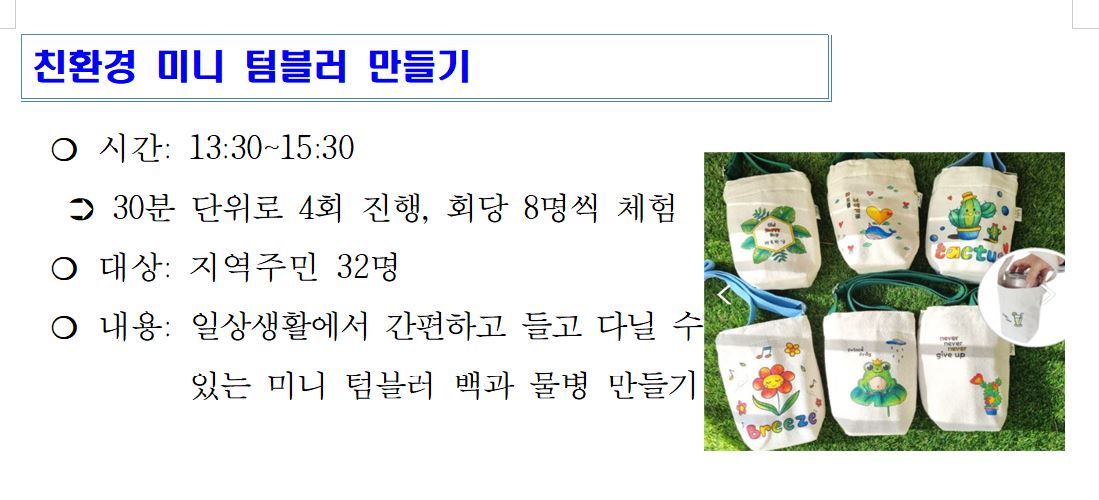| [희망나눔 북캠프] (체험)친환경 미니 텀블러 만들기 2차(14:30~15:30) [지역주민(유아6세~성인] | |||