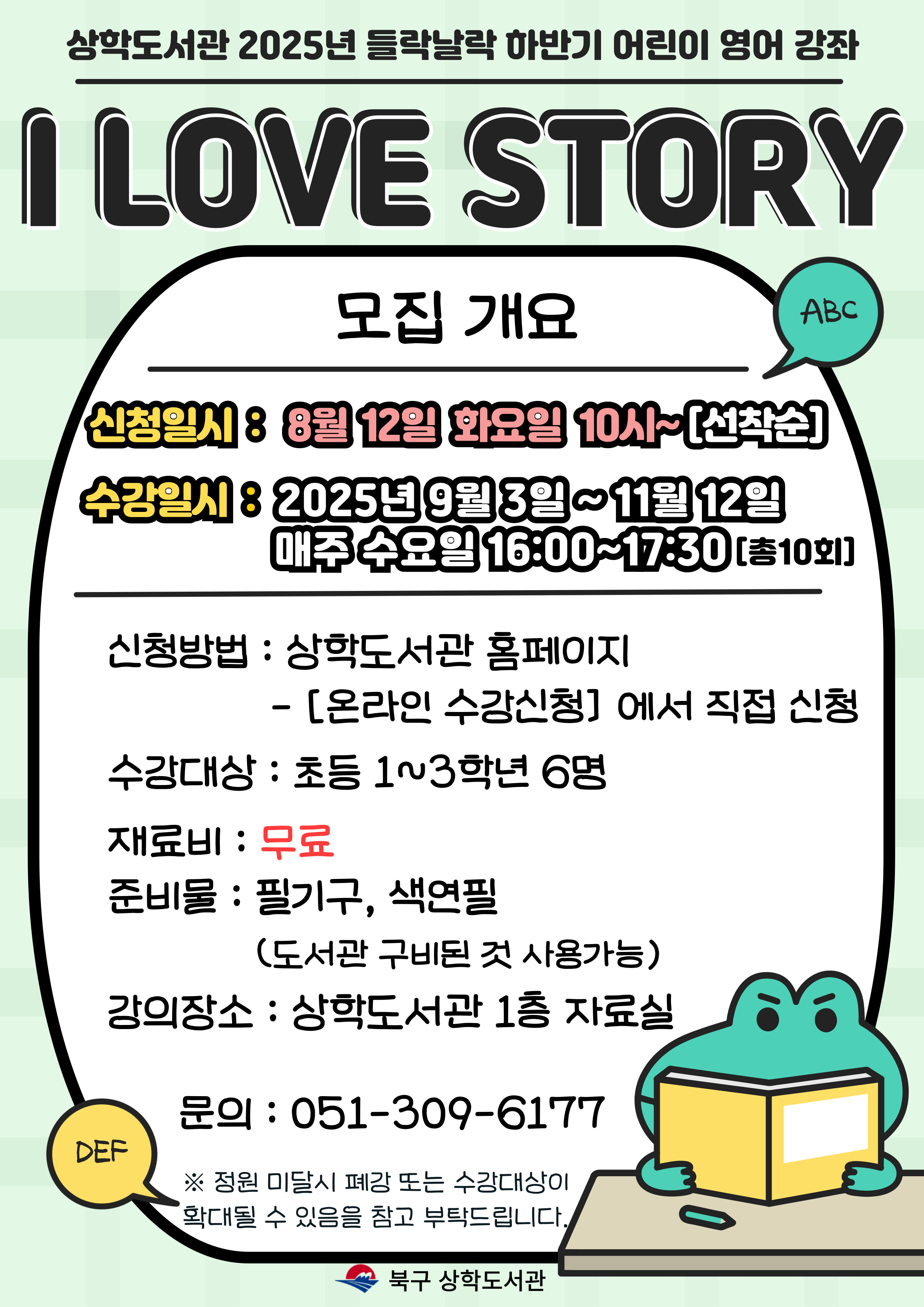 ![]() ○ 일 시: 2025. 9. 3.~11.12. 매주 수요일 16:00~17:30 [총 10회] ※ 10.8. (공휴일) 휴강 ○ 대 상: 초등1~3학년 6명 (선착순마감) ○ 장 소: 상학도서관 1층 ○ 수강료 및 재료비 : 무료 ○ 한 ID당 수강생 한 명만 신청이 가능합니다. ○ ★비고란: 자녀(수강생)성함/생년월일/성별★ --------------------------------------- 문의 : ☎051-309-6177(상학도서관) |