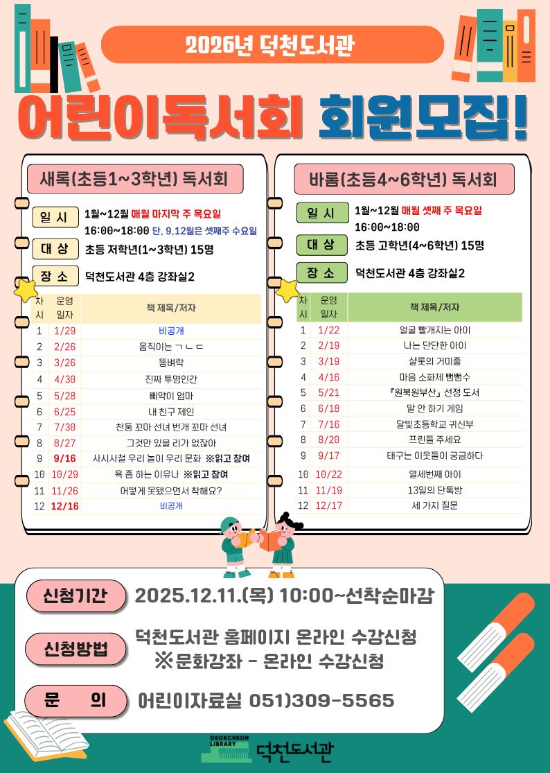 | [덕천도서관] 2026년 어린이 독서회 <새록 독서회> (초등 1~3학년) | |||