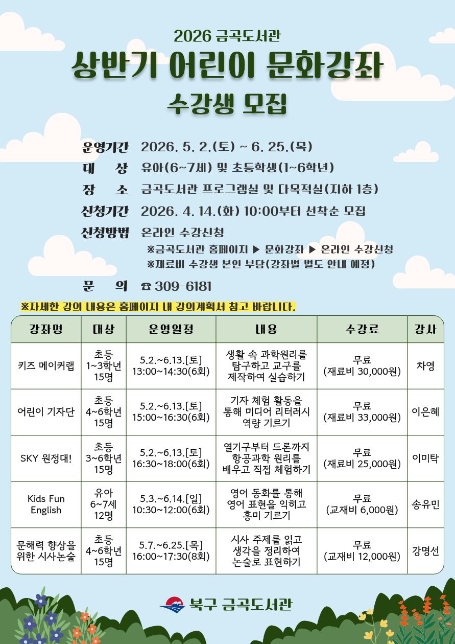 | 2026년 금곡도서관 상반기 어린이 문화강좌 [어린이 기자단](4~6학년) | |||